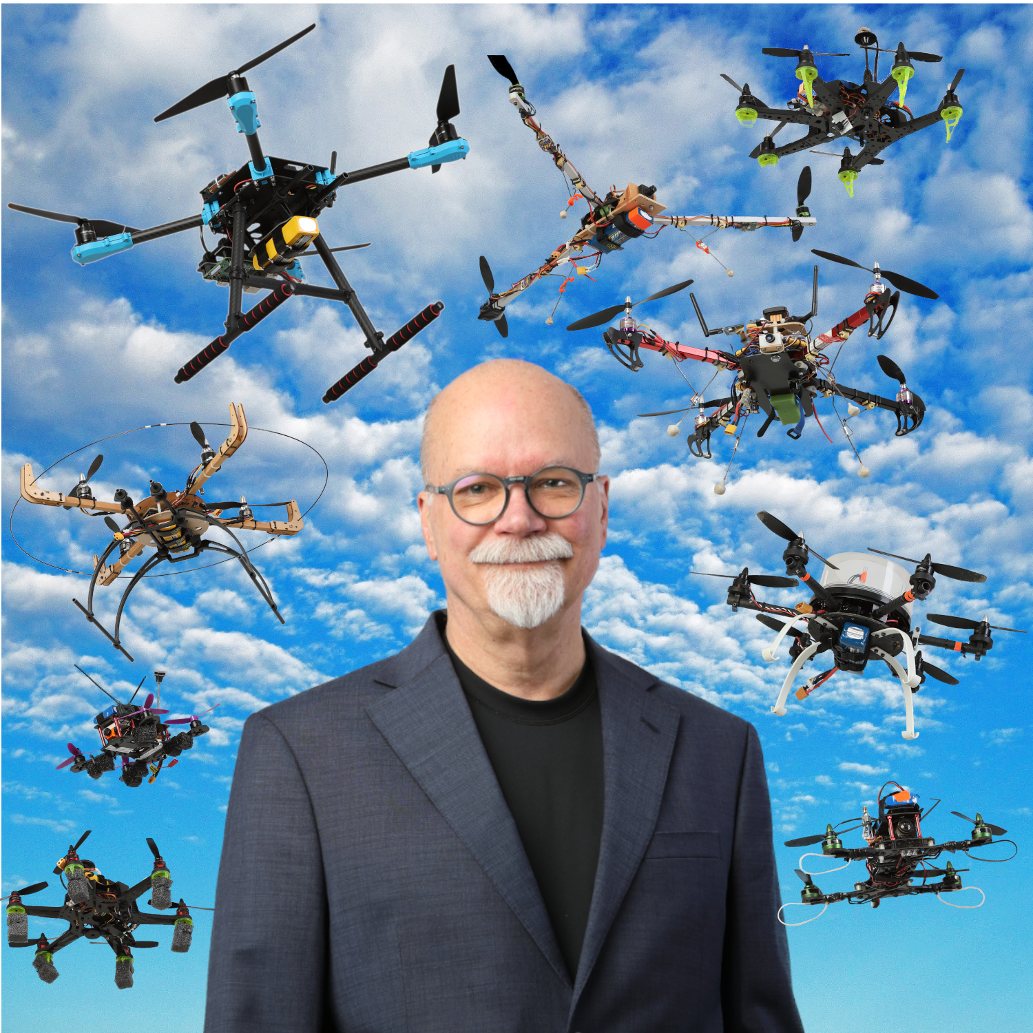 The photo below shows some of the drones I have flown for fun and research. The research ones include an Ardupilot flight controller and a raspberry pi computer that I program in python. The quadcopter in the upper left is my primary research platform today.