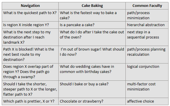 I suspect that navigation provides a key part of the computational framework for problem solving, tool making and language acquisition that AI lacks. You can see how the challenges of navigation map onto other domains, such as baking a cake.