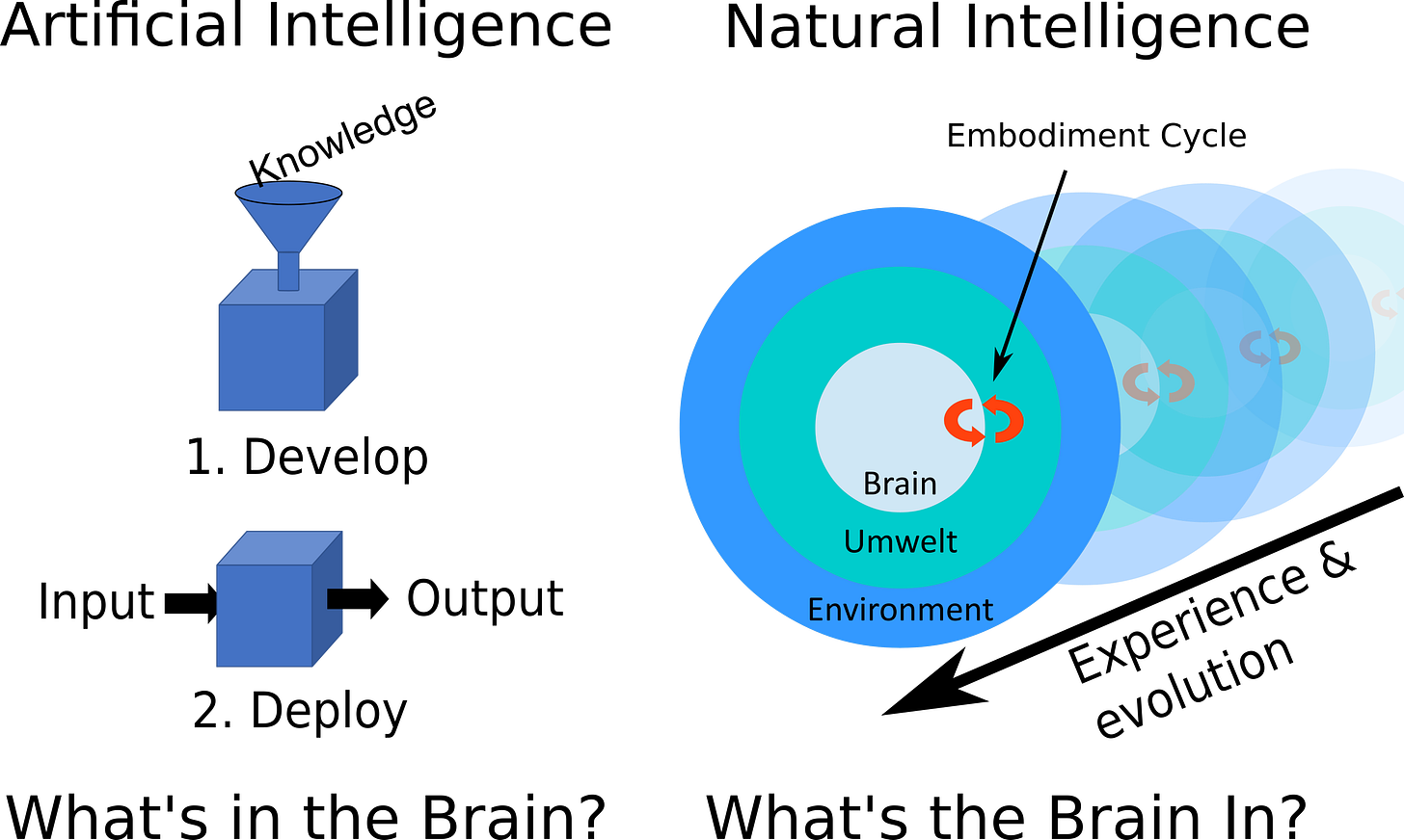 One way that embodied cognition differs from AI is how it interacts with its environment. If you raise an infant mammal in a box, devoid of socialization or interaction with a rich environment, it grows up with permanent cognitive impairment. That is because the perception of one's own action are necessary for development and learning. Unlike embodied cognition, AI is programmed with training data from a knowledge engineer. AI's process topology is not a perception-action loop (what I call an embodiment cycle) but a reflexive arc: ask a question (input), get an answer (output). Once deployed, an AI learns nothing. This is illustrated below. AI asks what is in the brain; natural intelligence asks what is the brain in.