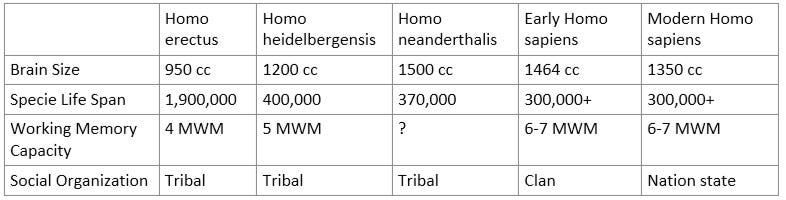 Note: Neanderthals are not ancestors of extant humans. Homo heidelbergensis is the last common ancestor for both Homo neanderthalis and Homo sapiens. MWM stands for Miller Working Memory, one of several working memory measures.